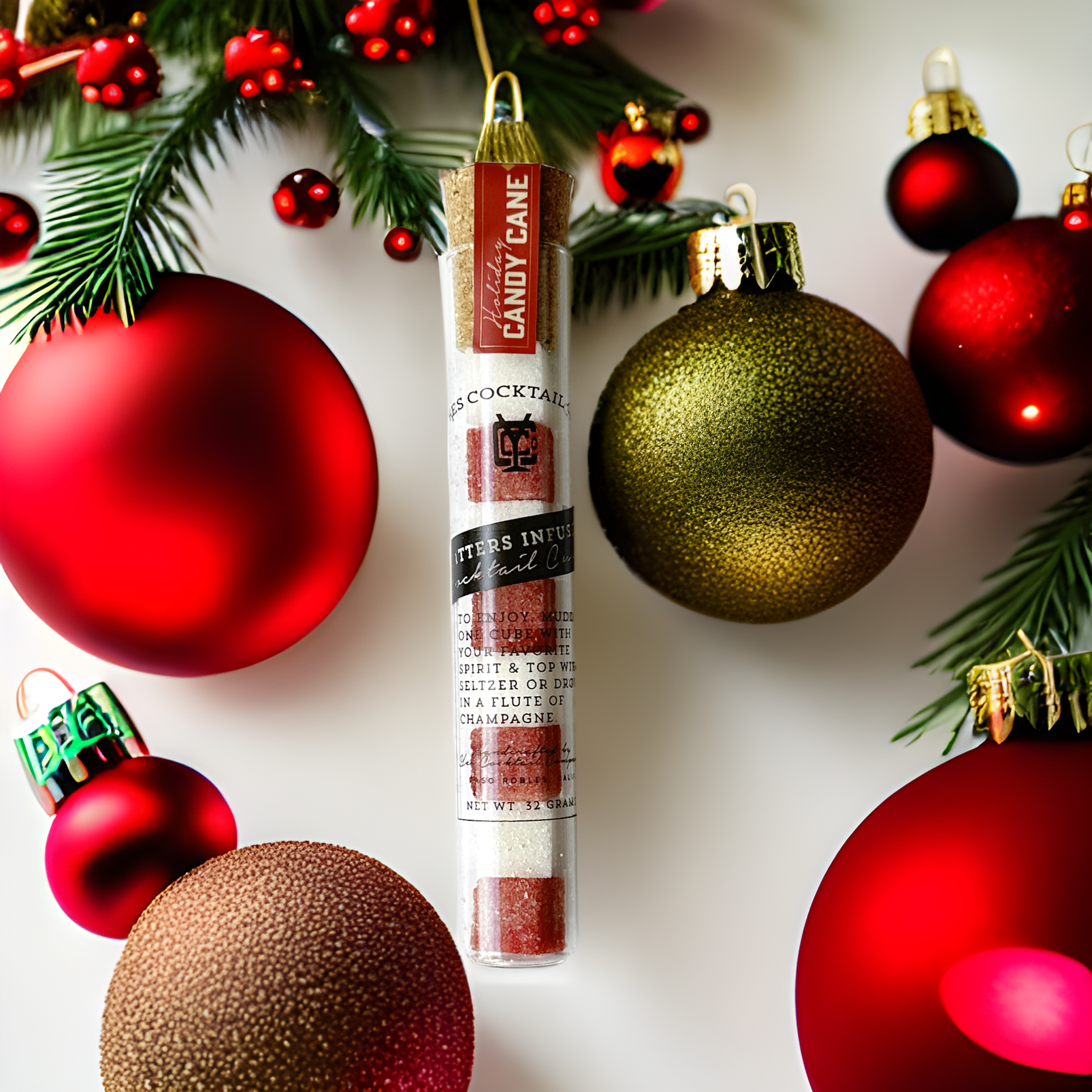 Elegantly packaged in glass vials. The peppermint aroma whispers of cozy firesides and sparkling celebrations. These cubes are a natural centerpiece for holiday cocktail mixers, festive cocktail syrups, and premium craft cocktail gift sets. Perfect for Christmas morning mimosas, après-ski spritzers, or as a chic accent to a winter cocktail essentials display.