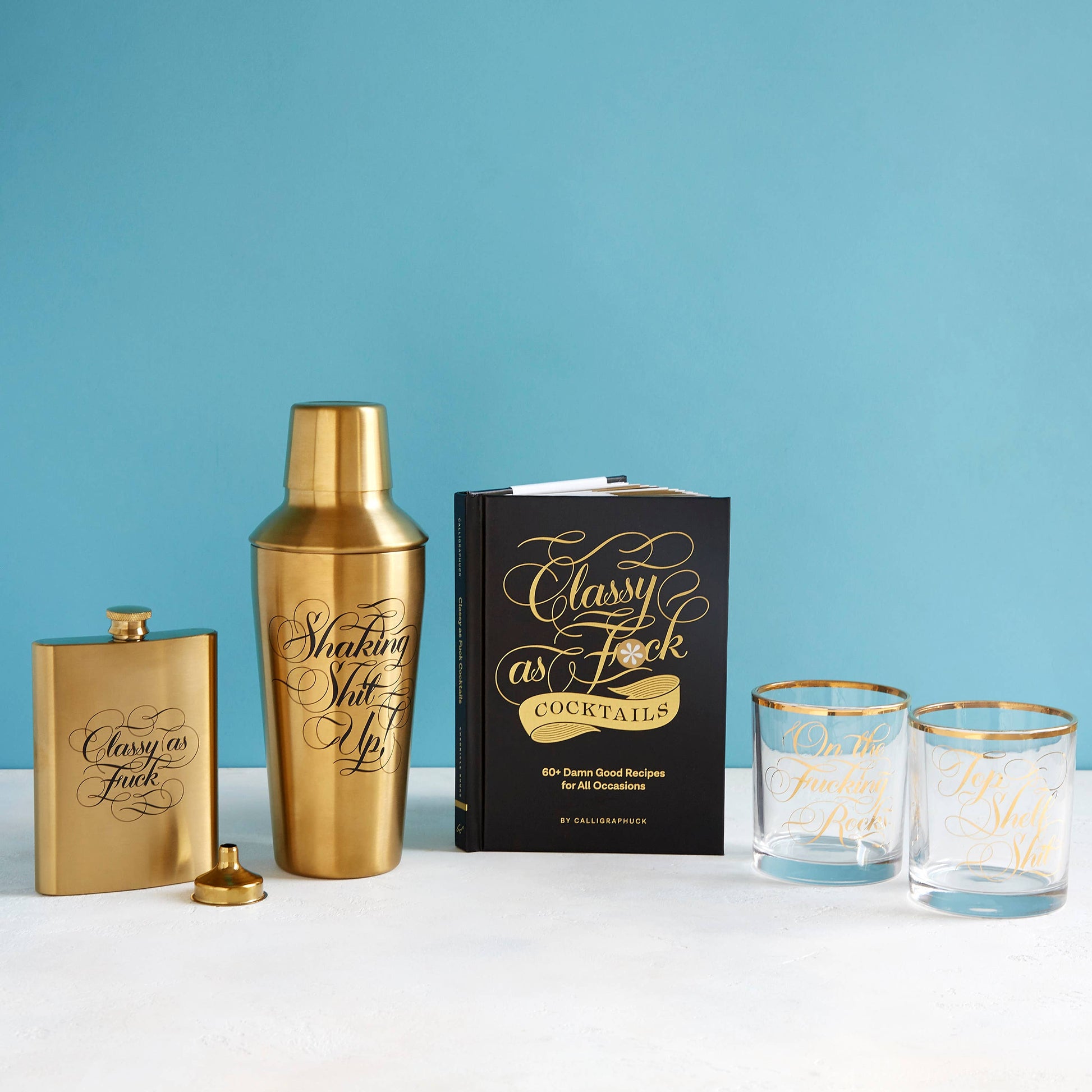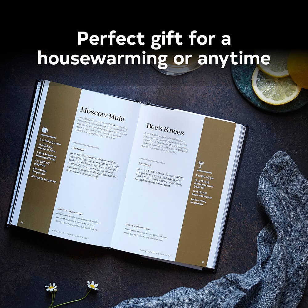 This cocktail collection is a fucking must for beginners and experienced mixologists alike. Complete with a gold foil-stamped cover, gilded page edges, metallic ink, and sassy calligraphy throughout, this makes this a stylish addition to any home bar.