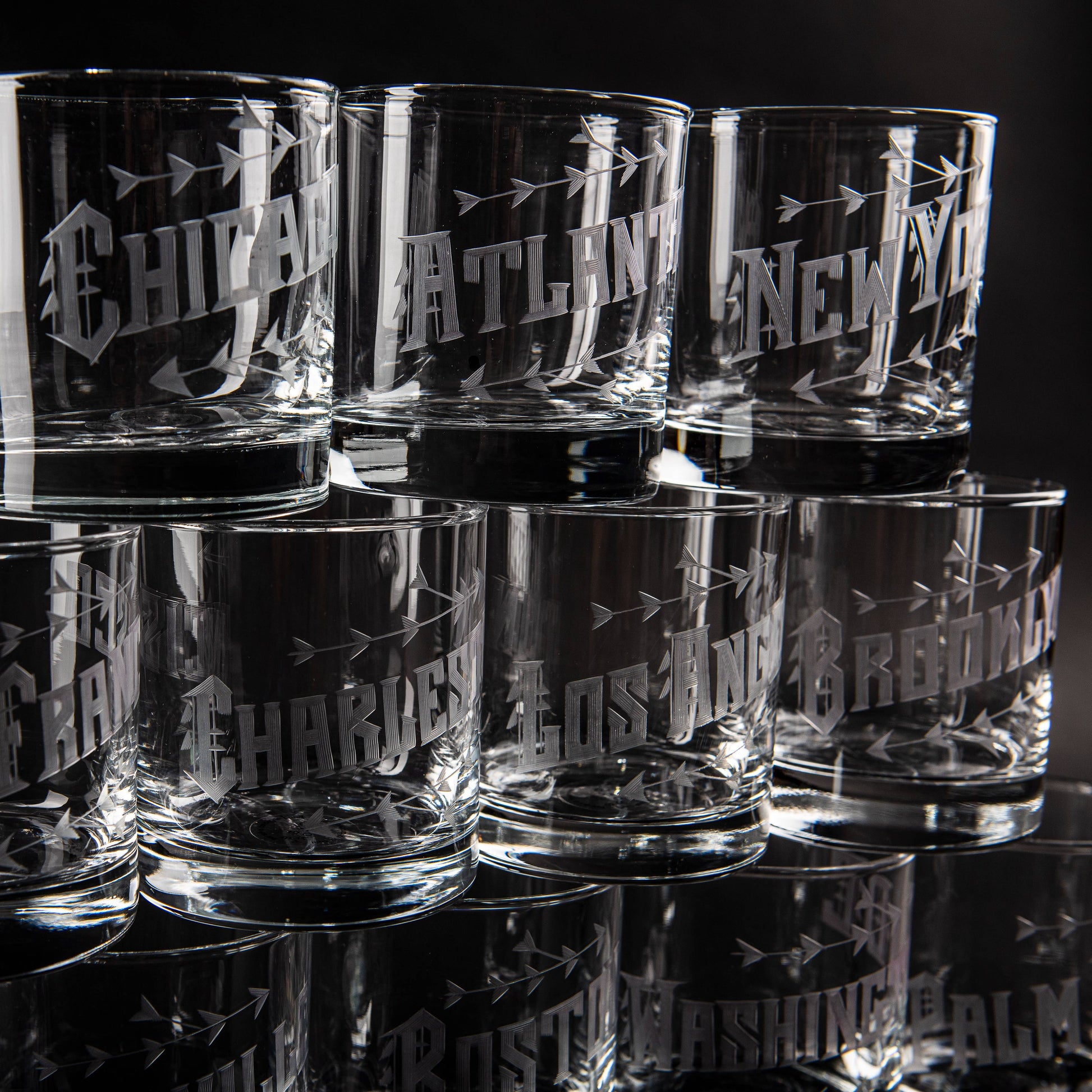 Hand Engraved 10 oz low-ball glasses.