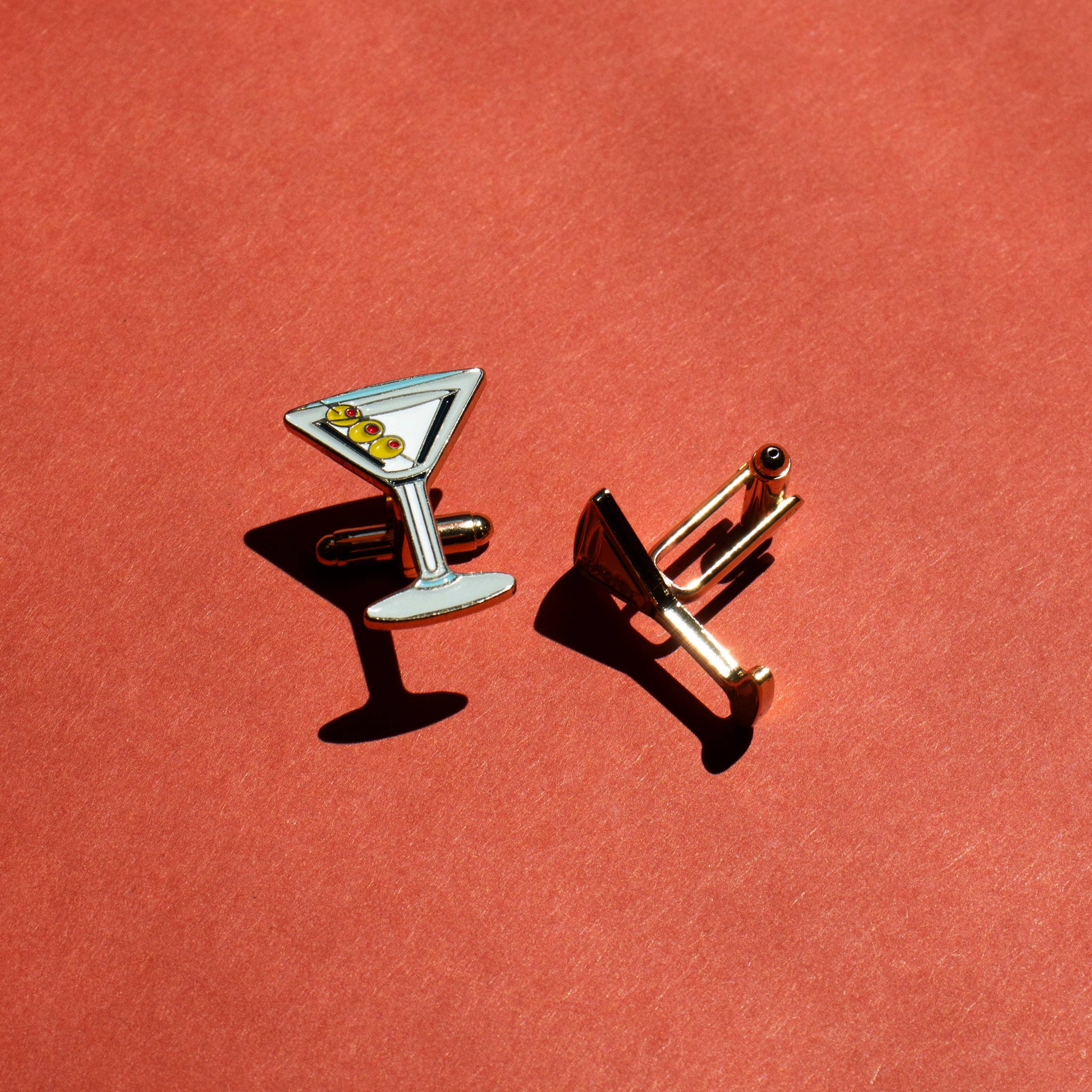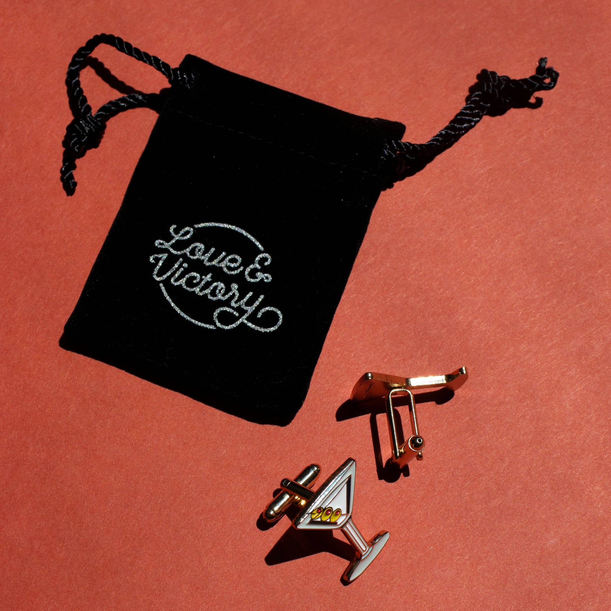 Enamel cufflinks to celebrate your favorite drink… a Martini! Packaged in a custom printed pouch.