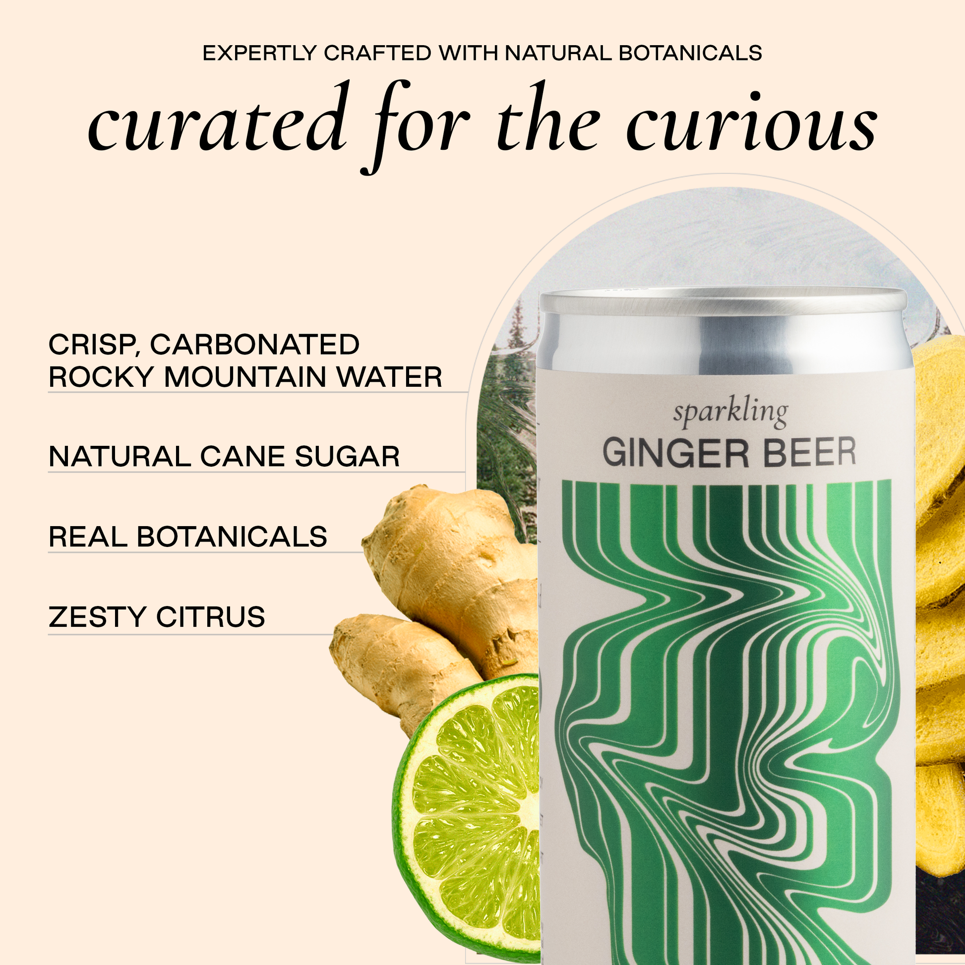 This Ginger Beer brings bright botanicals for bold flavor, including real, robust, sweet, and spicy ginger root. Crisp, refreshing Rocky Mountain water carbonated at high altitude for lively champagne-sized bubbles.